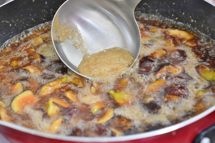全体にどろっとなってきたら砂糖を加えていきます。イチゴなどのジャムを作る時は、普通材料の目方の50%~70%の砂糖を入れますが、いちじくは糖分が多いので、材料の10%~20%くらいの砂糖で十分なようです。もちろん甘いほうが好みであれば、たくさん入れても構いません。甘さを見ながら調整していって下さい。